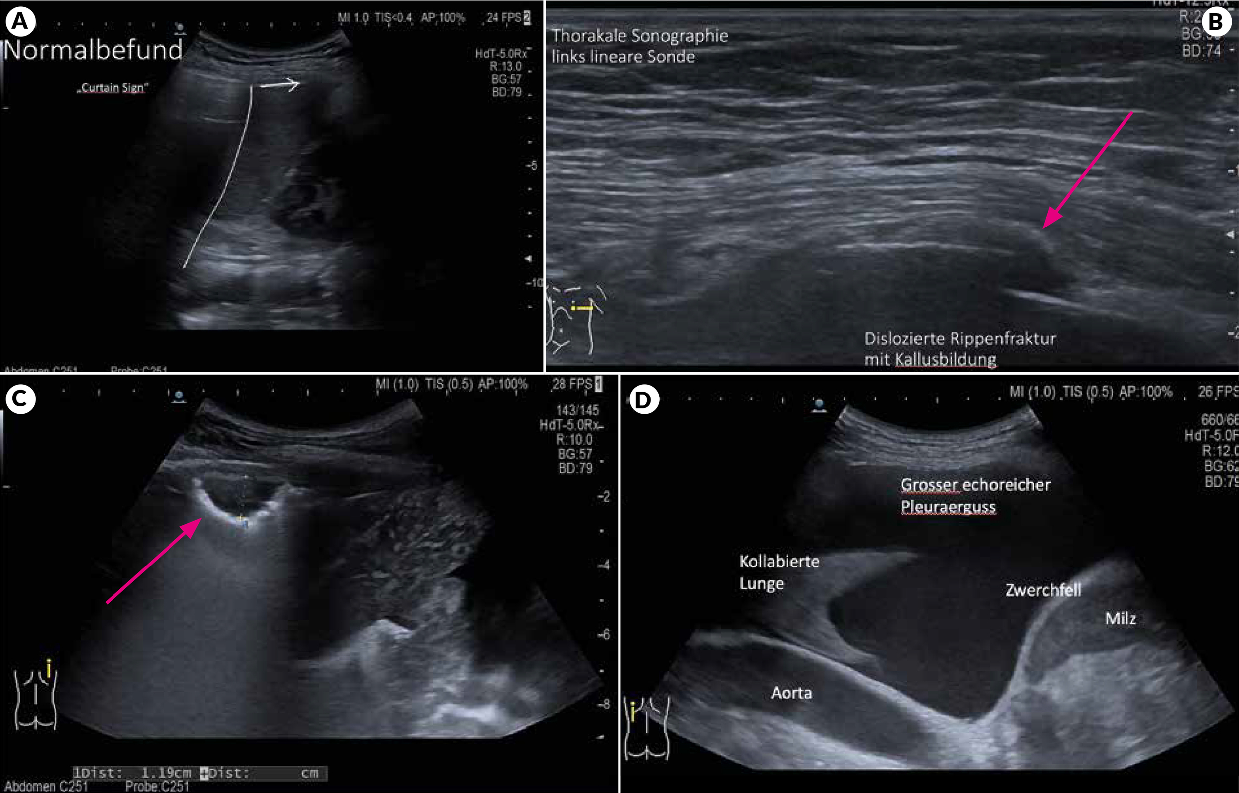 Die Diagnose einer Rippenfraktur mittels Thoraxröntgen ist unzuverlässig. Bei klinischem Verdacht bietet hier die thorakale Sonographie eine deutlich bessere Sensitivität (Abbildung 2B).4 Es empfiehlt sich mit der linearen Sonde dem Rippenverlauf zu folgen und die Rippen «abzufahren». Desweiteren sollte die Stelle maximaler Schmerzintensität vom Patienten bestmöglich lokalisiert und dort gezielt die Fraktur gesucht werden.