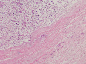 An interdisciplinary team, including infectious diseases, pneumology, thoracic surgery and internal medicine, reached a consensus for surgical resection. This decision was made based on the extensive findings and reported hemoptysis as a sign of advanced fungal angioinvasion. Six days after admission to our hospital, video-assisted thoracoscopic surgery was performed with total resection of the right lower lobe and partial right parietal pleurectomy. Histologic examination of the lung tissue showed an angioinvasive filamentous fungal infection compatible with Mucorales with circumscribed necrosis and no involvement of the resected parietal pleura (Figure 4 and Figure 5).